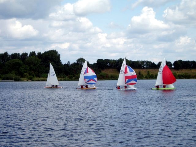 Samstag war für eine kurze Zeit so starker Wind, dass auch Sebastian im Trapez stehen konnte, und sogar auf unserem Baggersee Wellen entstanden. Bei den Tempos brechen die Wellen am stumpfen Bug und gelangen relativ schnell ins Cockpit. Ein dank Doppelboden selbstlenzendes Cockpit gewöhnt standen wir plötzlich vor der Aufgabe, das Wasser mit Lenzern und Schwämmen wieder hinauszubefördern. Carolins Vorschoter und Sebastians Steuermann gaben sich größte Mühe, trotz unseres Mangels an Erfahrung mit uns gute Ergebnisse zu erreichen. Carolin hat sich achtbar geschlagen (5. Platz), Sebastian und Steuermann wurden leider Letzte.